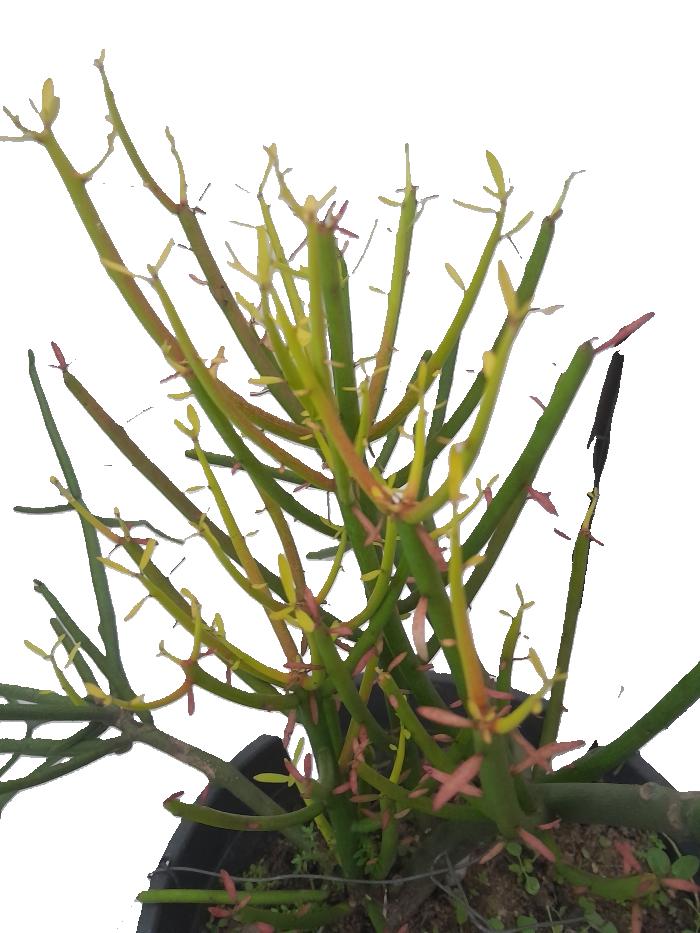 A Aveloz (Euphorbia tirucalli), também conhecida como graveto-do-cão ou pau-incendiário, é uma planta suculenta da família Euphorbiaceae. É originária da África e se destaca por seus ramos finos e cilíndricos, que são frequentemente confundidos com cactos, embora pertença a uma família diferente. A seiva leitosa do aveloz é tóxica e pode causar irritações na pele e nos olhos, sendo importante ter cautela ao manuseá-la.